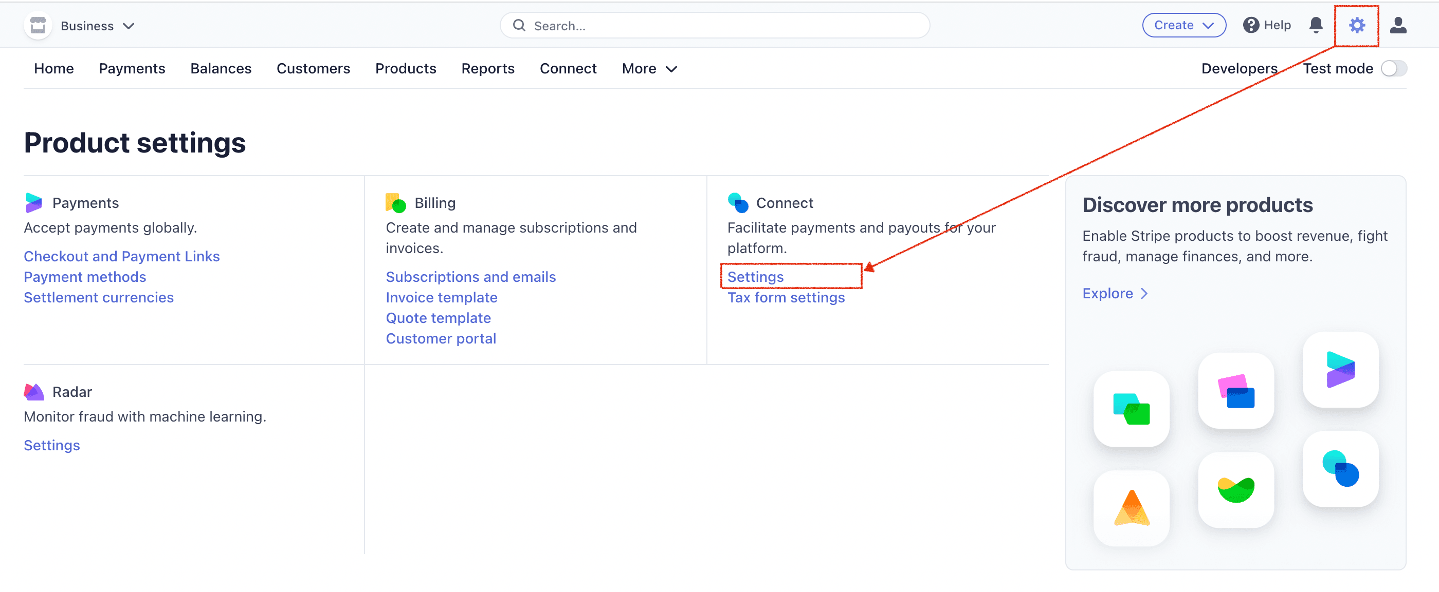 3. Now when you click the gear icon on the top bar to go to Settings at https://dashboard.stripe.com/settings, you will see a new Connect section. Click Settings in that section.