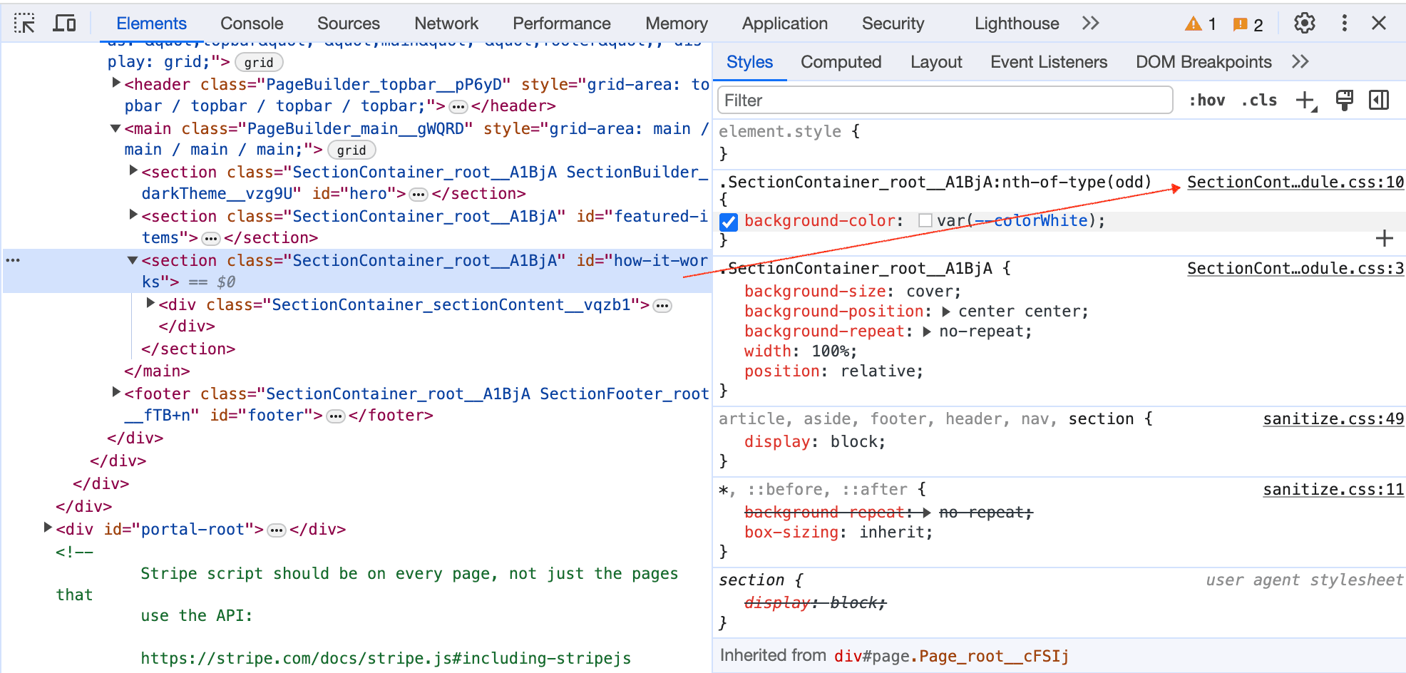 By default, the background color of the sections on the landing page alternates between white and grey. Our goal is to change the colors to alternate between grey and a light pastel pink.